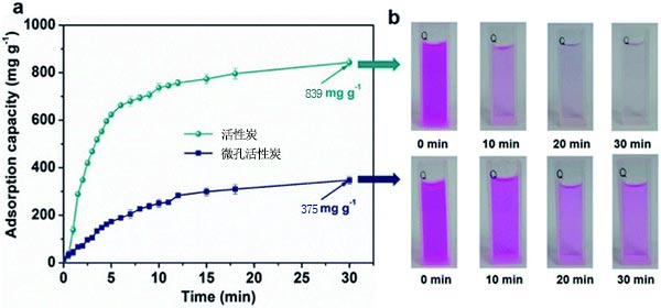 圖3、(a)多孔活性炭和微孔活性炭在超聲輔助吸附試驗下作為時間函數(shù)的吸附容量;(b)兩種活性炭隨時間的上清液的顯色過程。